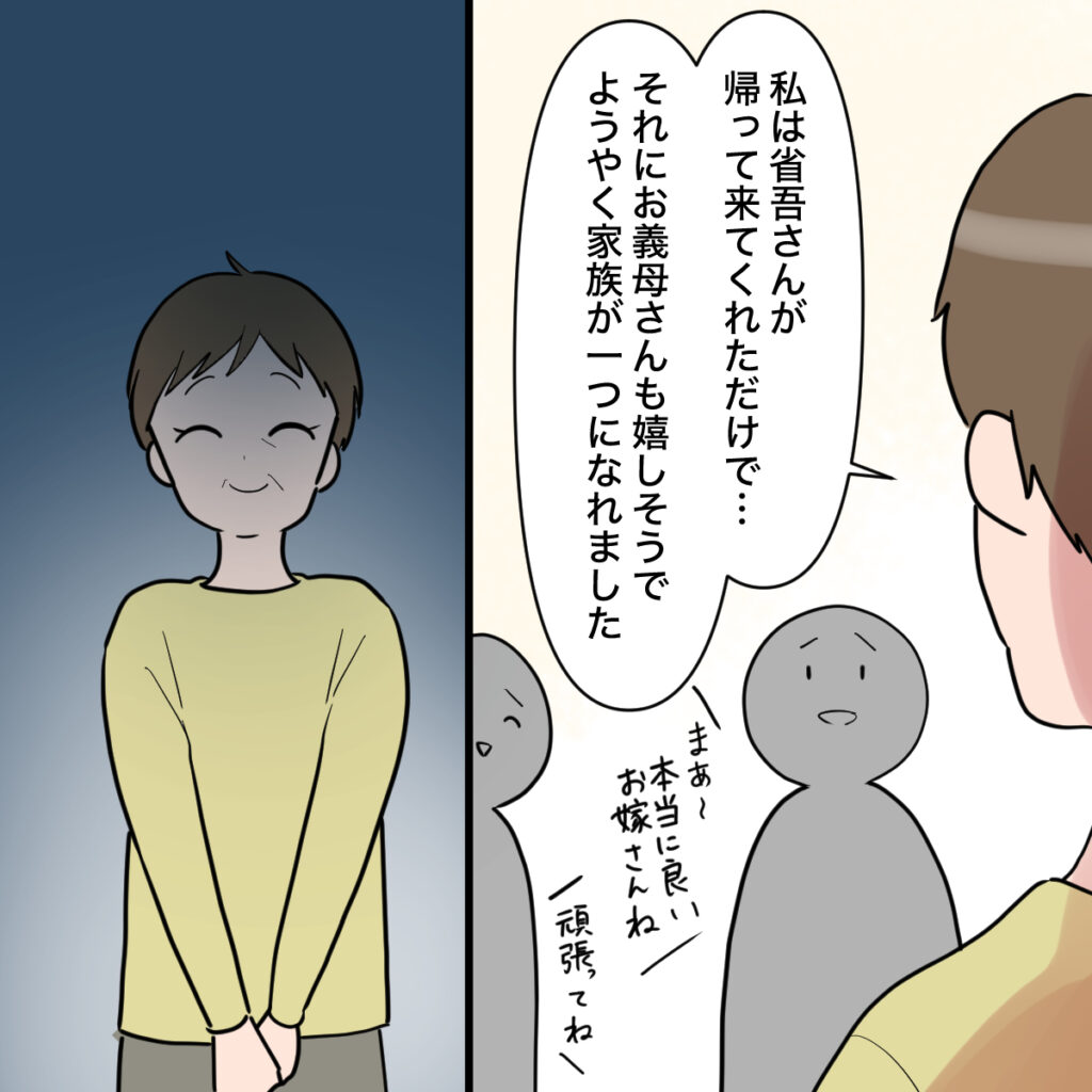 「私は省吾さんが帰って来てくれただけで・・・それにお義母さんも嬉しそうで、ようやく家族が一つになれました」そう言って、良い嫁を装いました。この家の土地や資産を滞りなく受け継ぐためには、義母と省吾さんが亡くなるその時まで、献身的な良い嫁を演じ続けなければなりませんでした。