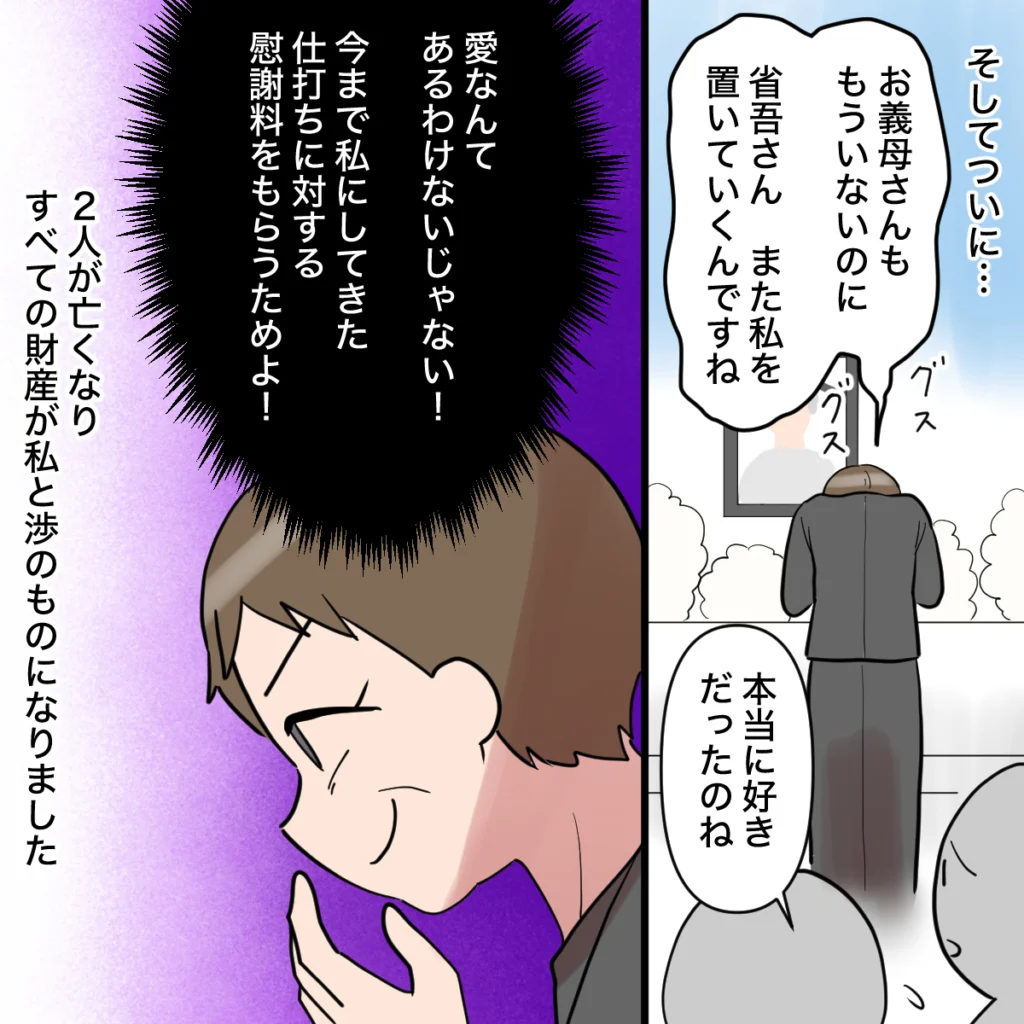 そしてついに、義母と夫が亡くなりました。私は棺の前で「お義母さんももういないのに、省吾さん、また私を置いていくんですね」と声を震わせ、最後まで献身的な妻を演じます。けれど、そこに愛情はこれっぽっちもありませんでした。これでようやく、これまで私が受けてきた仕打ちへの慰謝料を受け取ることができます。こうして2人を看取り、土地と遺産は私と息子のものとなりました。