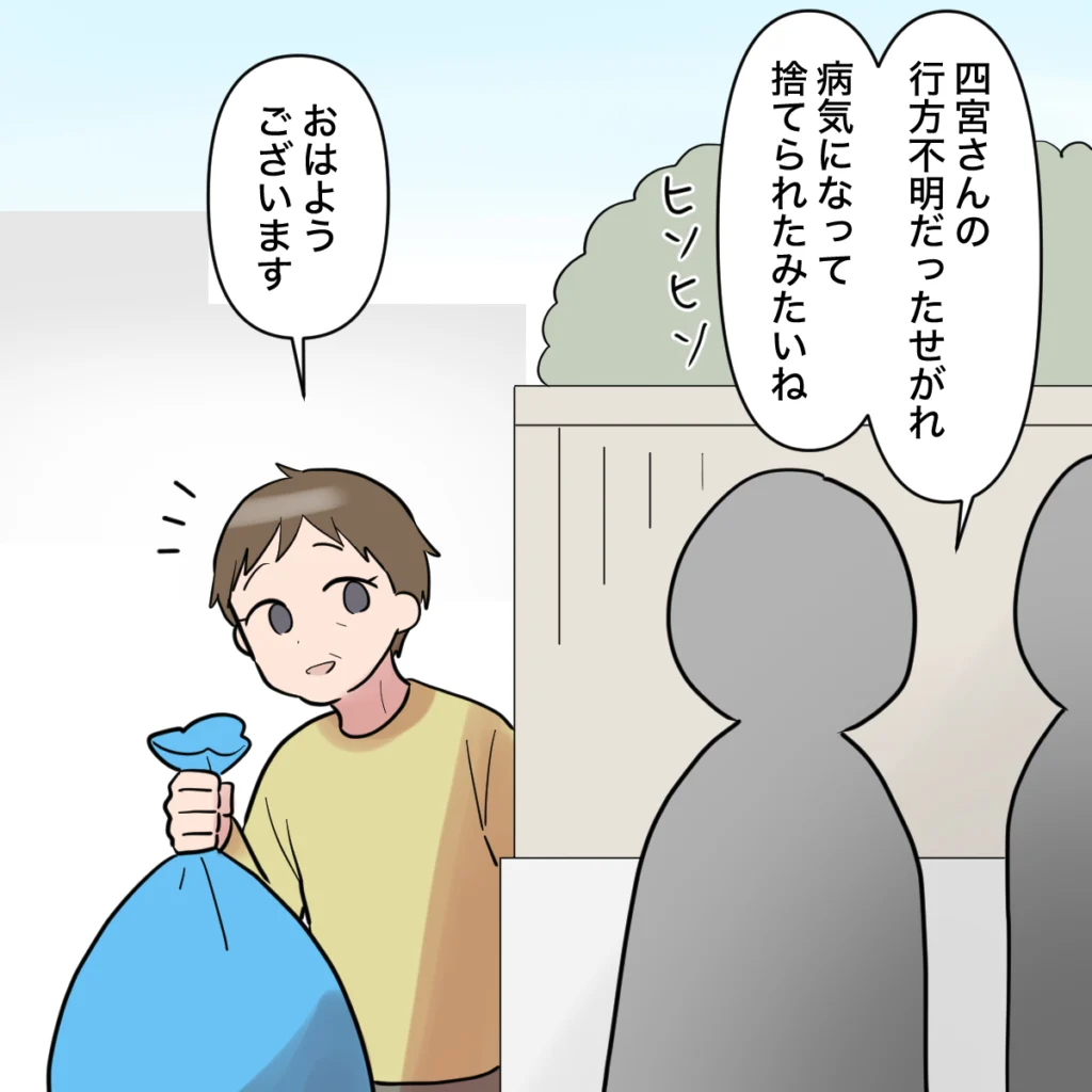 省吾さんが大病を患い、愛人に捨てられて戻ってきたという話は、あっという間にご近所中に広まりました。「四宮さんの行方不明だったせがれ、病気になって捨てられたみたいね」今朝も噂好きのご近所さんたちが、ひそひそと省吾さんの話をしていました。私は聞こえないふりをして、いつも通り「おはようございます」と挨拶します。
