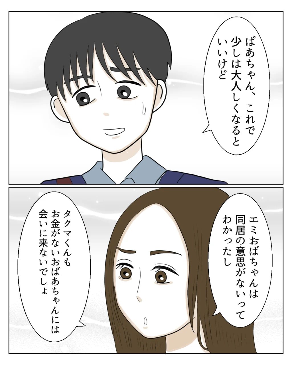 真矢から一連の出来事を聞いた孝介は、「ばあちゃん、これで少しは大人しくなるといいけど」と呆れ気味に言いました。それを聞いた真矢は、「エミおばちゃんは同居の意思がないってわかったし、タクマくんもお金がないおばあちゃんには会いに来ないでしょ」と答えます。