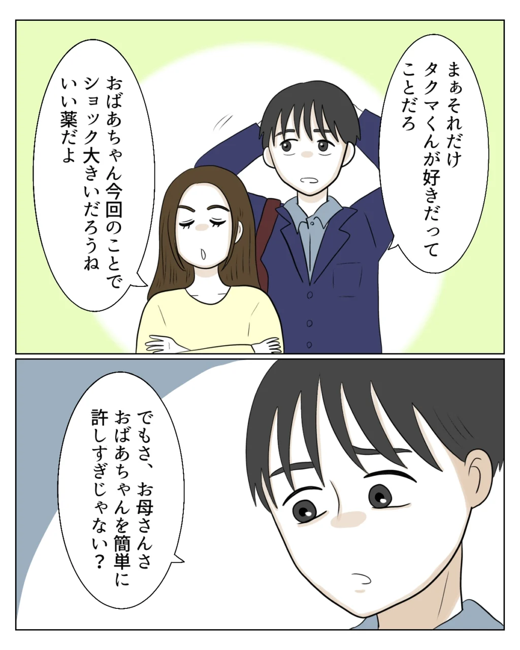 孝介は頭の後ろで手を組み、「まぁ、それだけタクマくんが好きだってことだろ」と言います。真矢も、「おばあちゃん今回のことでショック大きいだろうね、いい薬だよ」と呆れ気味に続けました。すると孝介は、どこか釈然としない表情で「でもお母さんさ、おばあちゃんを簡単に許しすぎじゃない?」と不満を口にします。