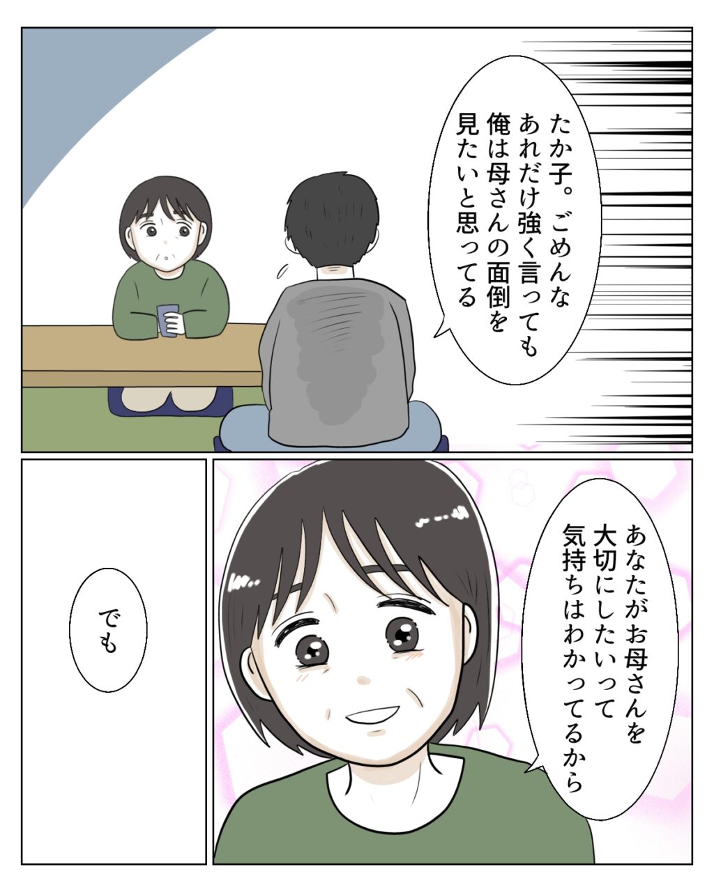場所は変わって和室。2人でお茶を飲んでいると、和也さんがふと真剣な表情になり「たか子ごめんな、あれだけ強く言っても俺は母さんの面倒を見たいと思ってる」と胸の内を明かしました。私は和也さんの目をまっすぐ見つめ、彼の気持ちに寄り添うように「あなたがお母さんを大切にしたいって気持ちはわかってるから」と答えました。