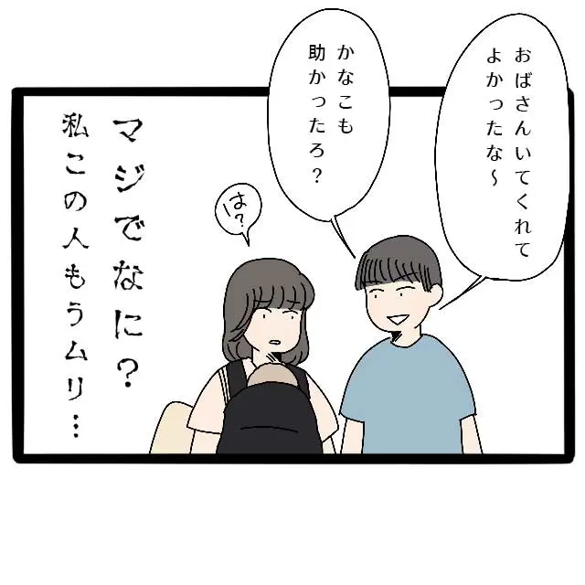 さよさんの言葉にぐうの音も出ないといった様子のコウタでしたが、部屋を移動している途中に「おばさん居てくれてよかったな~。かなこも助かったろ?」と言うのを聞いて、やっぱりコウタは何も分かっていなかったのだと思い知らされました。マジでなに?私この人もうムリ・・。