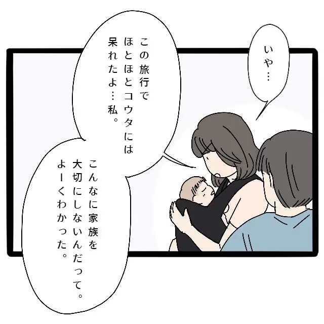 ここまでずっと我慢してきた私は「いや・・この旅行でほとほとコウタには呆れたよ・・私。こんなに家族を大切にしないんだって。よーくわかった」と怒りを込めてはっきりコウタに伝えました。