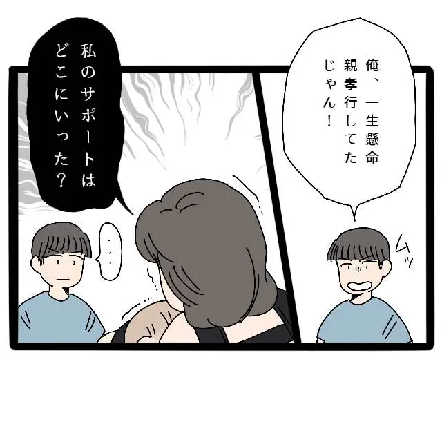 コウタはムッとして「俺、一生懸命親孝行してたじゃん!」と言い返してきたので、「私のサポートはどこにいった?」と怒りを堪えて問いかけました。