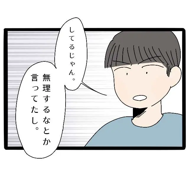 「サポートするから大丈夫」というコウタの言葉を信じた私がバカでした。「無理するな」の一言でサポートしたつもりになっているなんて呆れて言葉も出ません。これ以上話しても無駄だと感じた私は「・・もういい。疲れた。もう寝たい」と言って足早に部屋に向かいました。
