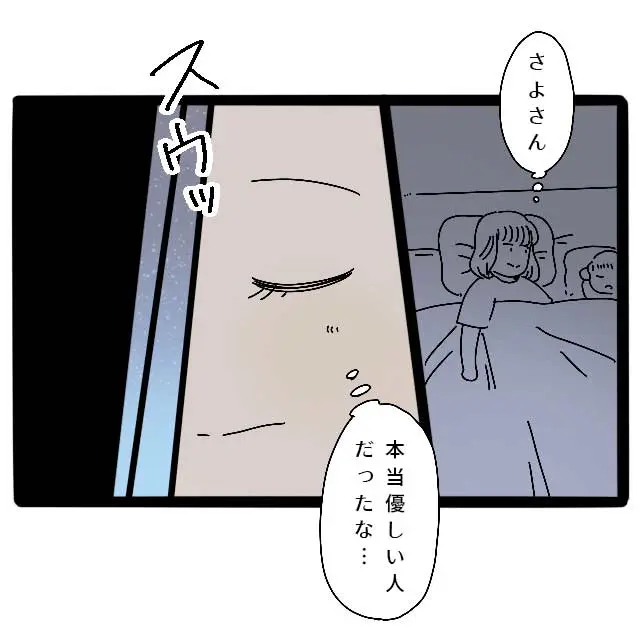 昨夜とは違い、今日は義両親に気を遣うことなく過ごせます。布団に入り、アオの寝顔を見ながら「さよさん、本当に優しい人だったな・・」と思い返して温かい気持ちになった私は、昨日からの疲れもあってすぐに眠りに落ちました。