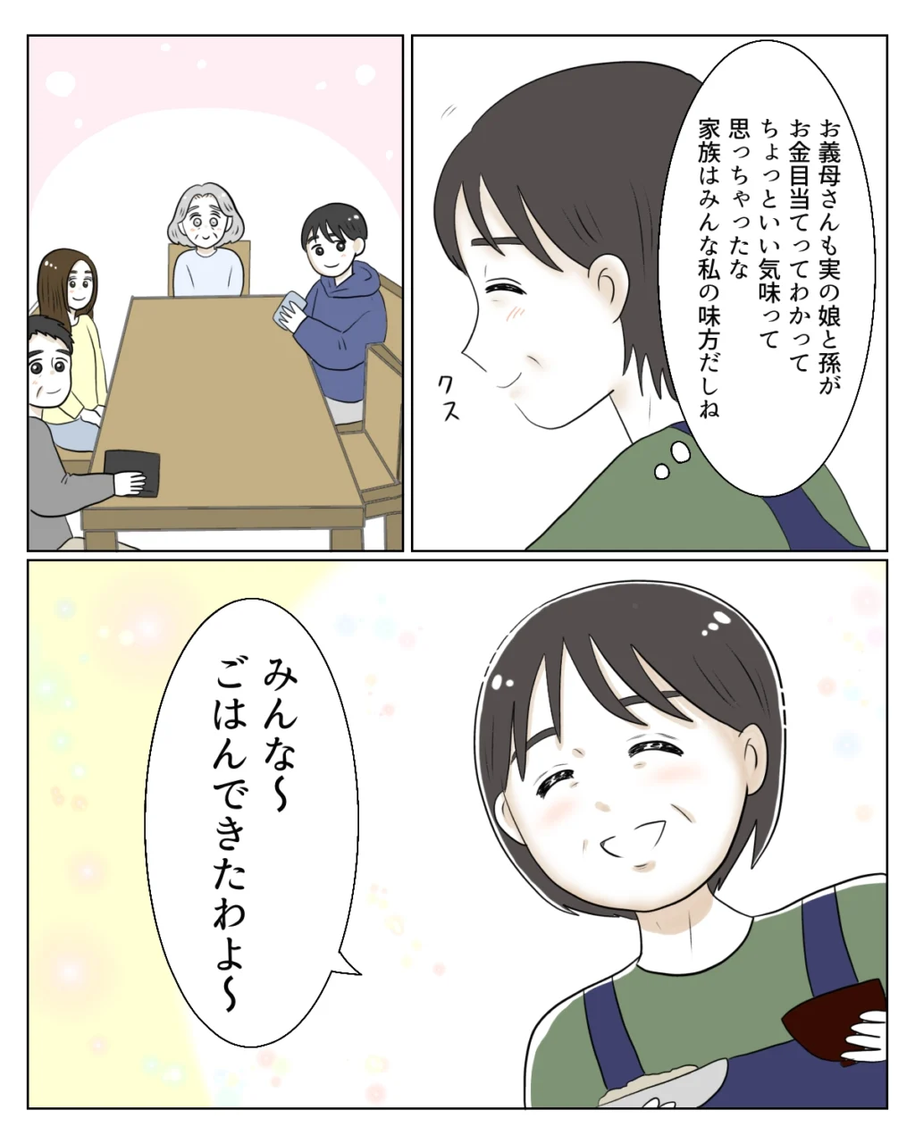 実の娘と孫がお金目当てだと知った義母を見たとき、正直いい気味だと思ってしまいました。和也さんも真矢も孝介も、この家の家族はみんな私の味方。エミさんとタクマくんが義母をかばわない以上、義母に頼れる相手はもういません。つまり、私に逆らえる人はいないということです。ここまで思い通りに事が運ぶなんて・・・私は喜びを隠すことなく、「みんな~ごはんできたわよ~」と満面の笑みで家族に声をかけました。
