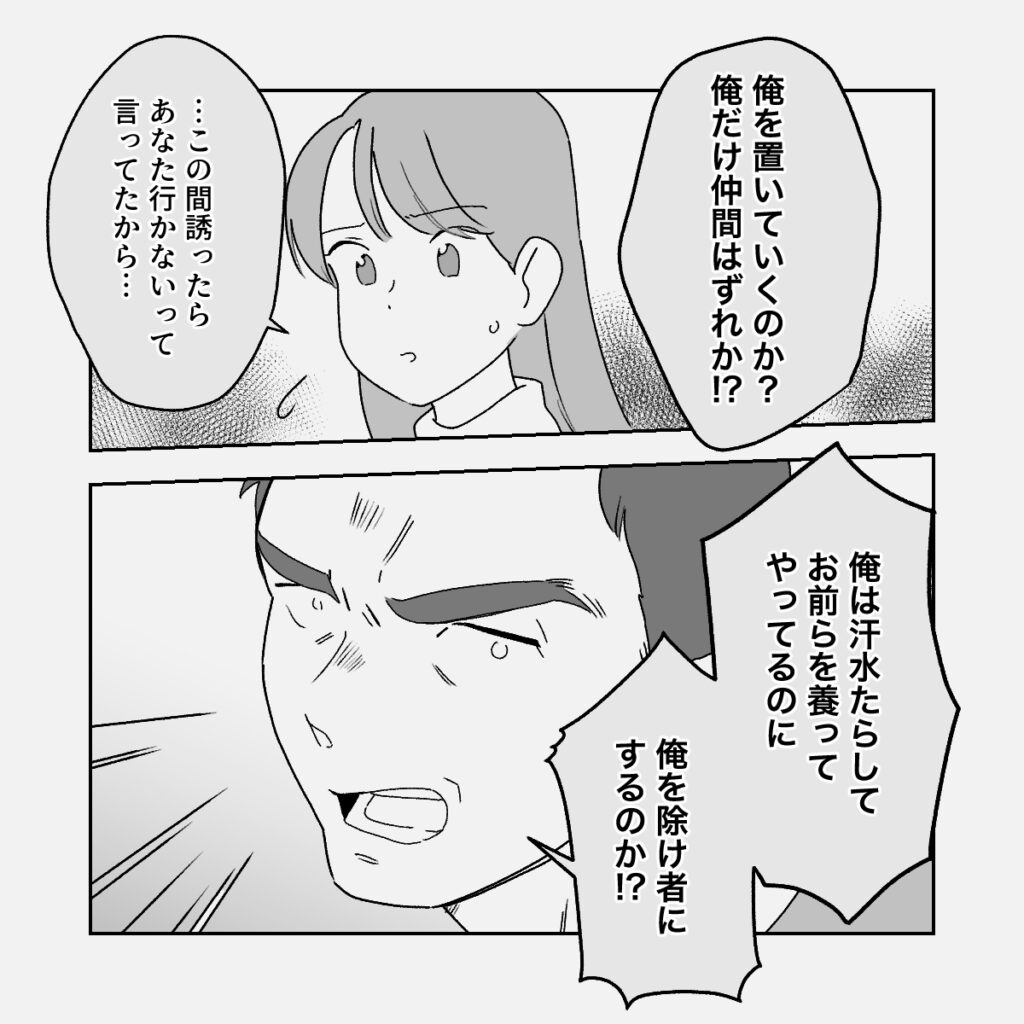 行き先も告げずに出かけようとしたことが気に障ったのか、義父は突然「俺を置いていくのか?俺だけ仲間はずれか!?」と声を荒らげました。義母が「この間誘ったらあなた行かないって言ってたから」と説明しても義父は聞く耳を持たず「俺は汗水たらしてお前らを養ってやってるのに、俺を除け者にするのか!?」と理不尽に責め立てます。