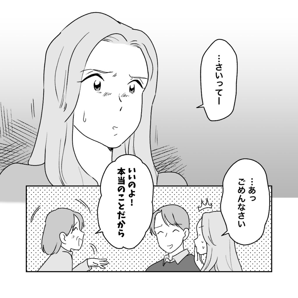 コウの話を聞いた私は、思わず「・・・さいってー」と口に出してしまいました。ですが、いくら最低とはいえ、義母とコウの家族。私は慌てて口に手を当て「あっ、ごめんなさい」と謝りました。義母とコウは笑いながら「いいのよ!本当のことだから」と受け流してくれました。