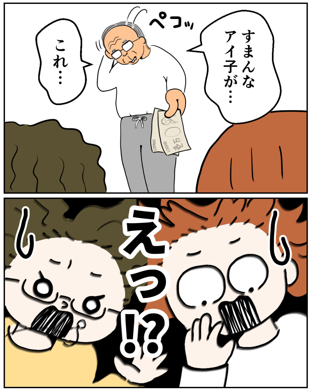義母の小言に耐えていると、横から義父が「すまんなアイ子が・・・これ」と頭を下げ、1万円札をさらに2枚そっと差し出してきました。あまりにも突然のことに、私とシノブさんは「えっ!?」と驚きます。