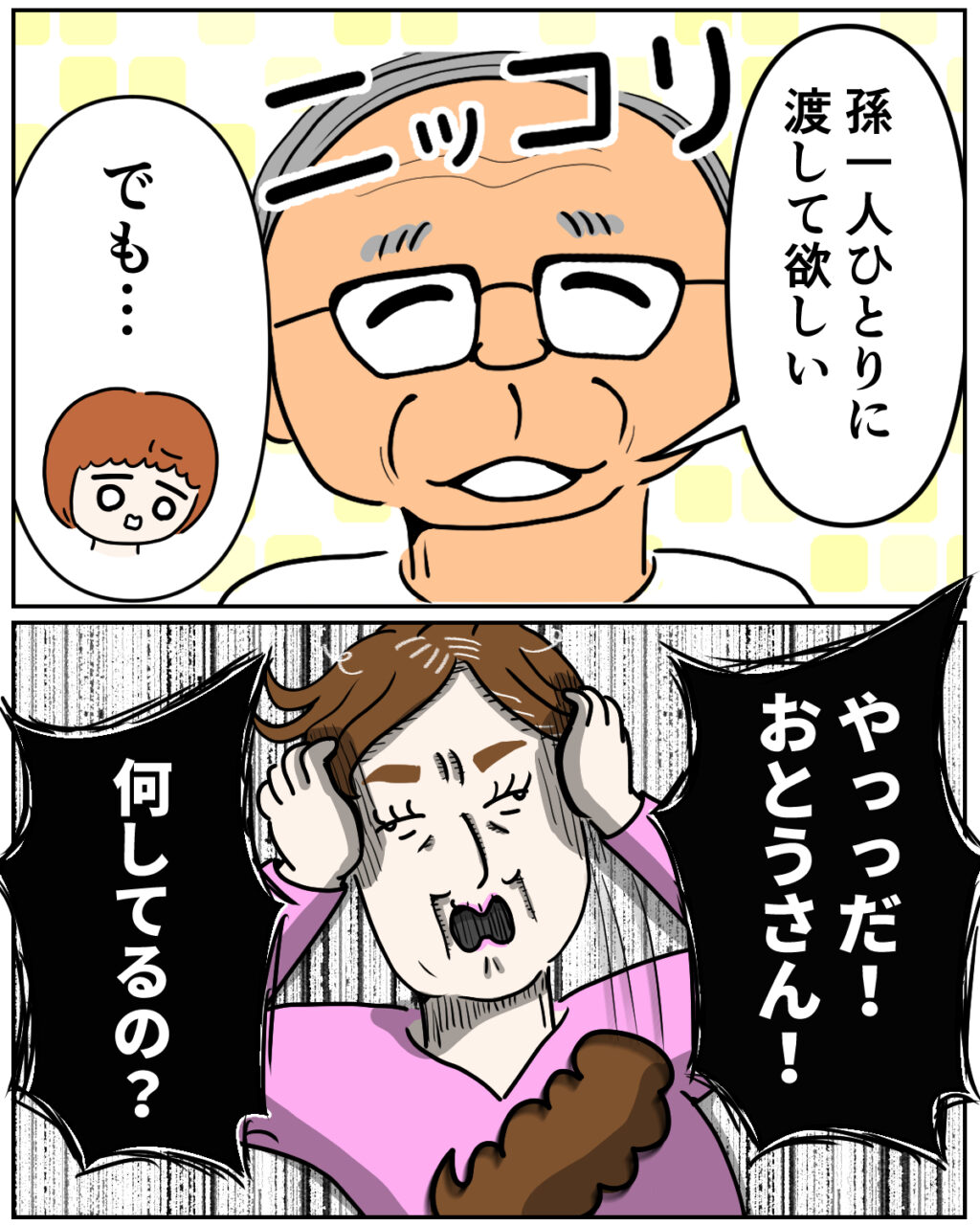 「孫一人ひとりに渡してほしい」そう言って、義父は私たちに穏やかな笑顔を向けました。私は「でも・・・」と言葉を詰まらせます。すると、その様子を見ていた義母が「やっっだ!おとうさん!何してるの?」と頭を抱えました。