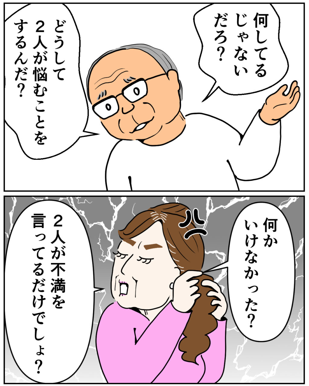 義父はヒステリックになる義母をなだめるように、「何してるじゃないだろ?どうして2人が悩むようなことをするんだ?」とたずねました。義母は不満そうに「何かいけなかった?2人が不満を言ってるだけでしょ?」と自分は悪くないという態度を崩しません。