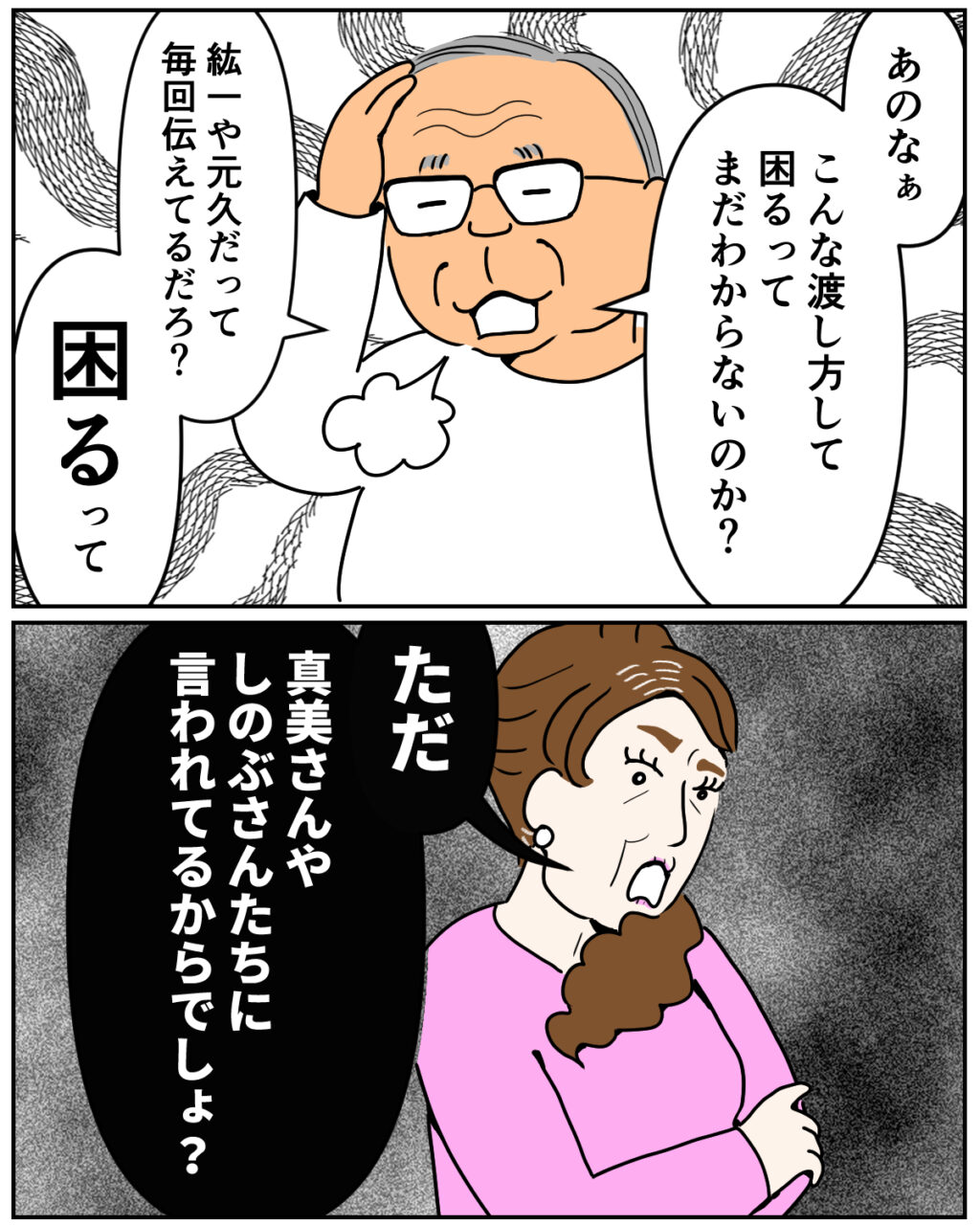 すると義父は呆れたようにため息をつき、「あのなぁ、こんな渡し方して困るってまだわからないのか?紘一や元久だって毎回伝えてるだろ?困るって」と諭します。それでも義母は、苛立った様子で腕を組み「ただ真美さんやシノブさんたちに言われてるからでしょ?」と反論。埒が明きません。