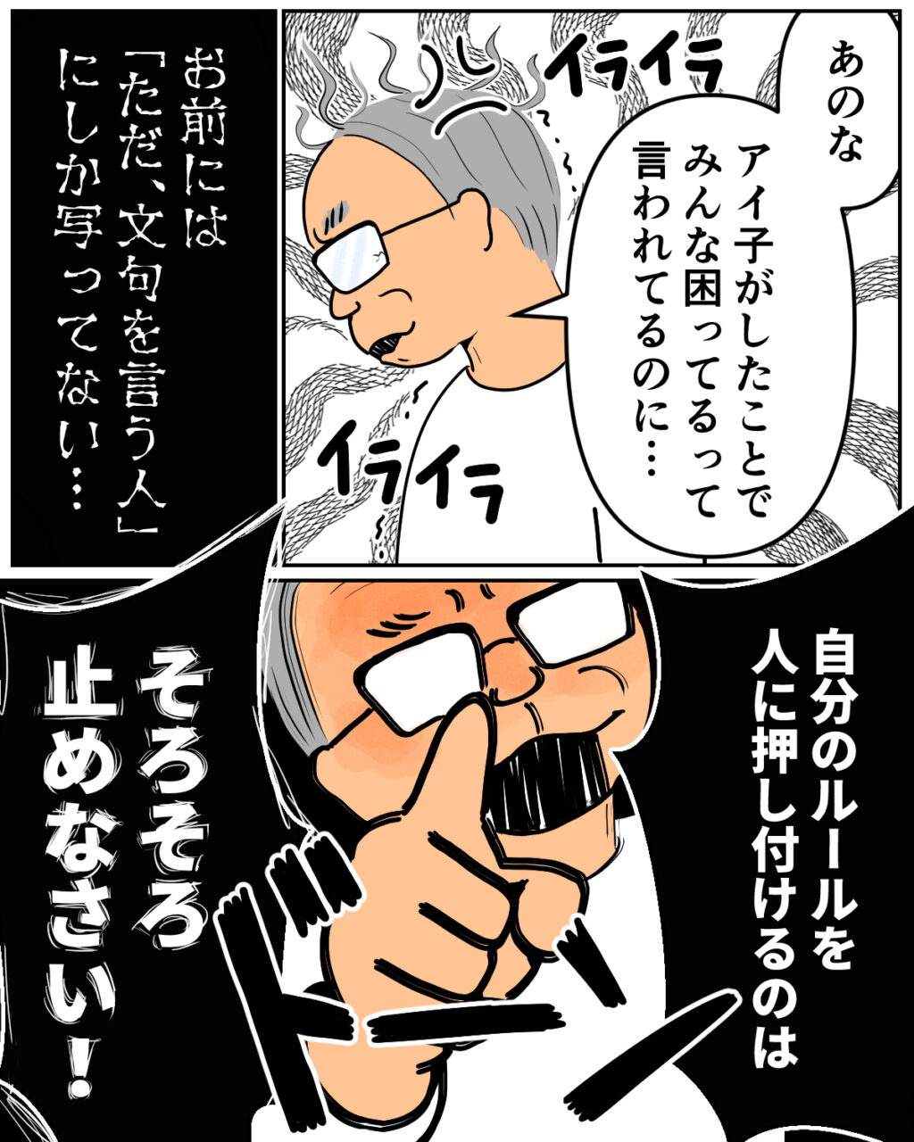 話がまったく通じない義母に、義父の苛立ちは次第に募っていきます。「あのな、アイ子がしたことでみんな困ってるって言われてるのに、お前には『ただ文句を言う人』にしか映ってない・・・」そう言うと義父は義母を指さし、「自分のルールを人に押し付けるのは、そろそろ止めなさい!」とハッキリ言いました。