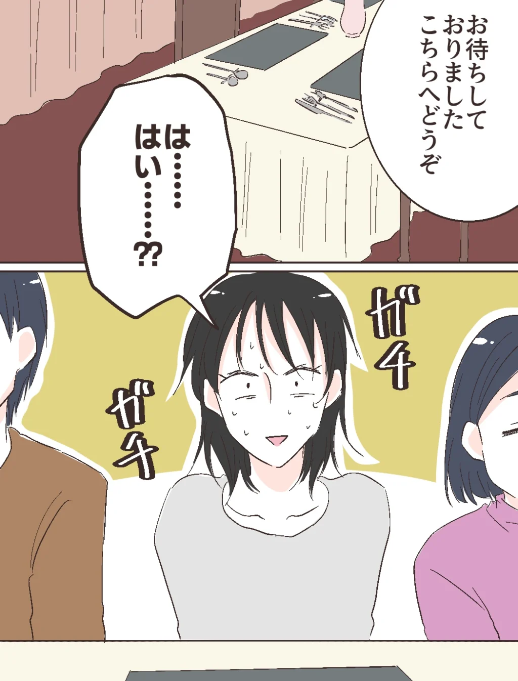 「お待ちしておりました。こちらへどうぞ」レストランでテーブルに案内された私たち。すると「は・・はい・・??」とさっきまでの勢いはどこへやらガチガチに固まっている智美さんの姿が。
