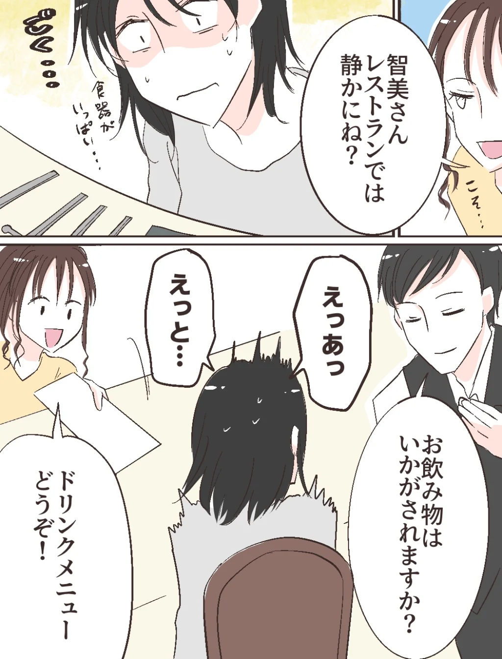 すると、「智美さん、レストランでは静かにね?」ふみのが智美さんの耳元でこそっと囁くも、目の前に並んだカトラリーにごくりと唾を飲み込む智美さん。「お飲み物はいかがされますか?」とたずねられ「えっあっ、えっと・・」と返事に困る智美さんに「ドリンクメニューどうぞ!」とふみのが差し出し、