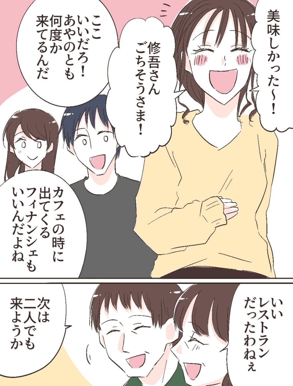 「美味しかった~!修吾さんごちそうさま!」ふみのが大満足でそう言うと、「ここいいだろ!あやのとも何度か来てるんだ」修吾の言葉に、「カフェの時に出て来るフィナンシェもいいんだよね」と私も言いました。義父と義母も、「いいレストランだったわねぇ」「次は二人でも来ようか」ととっても満足そうで安心している時、