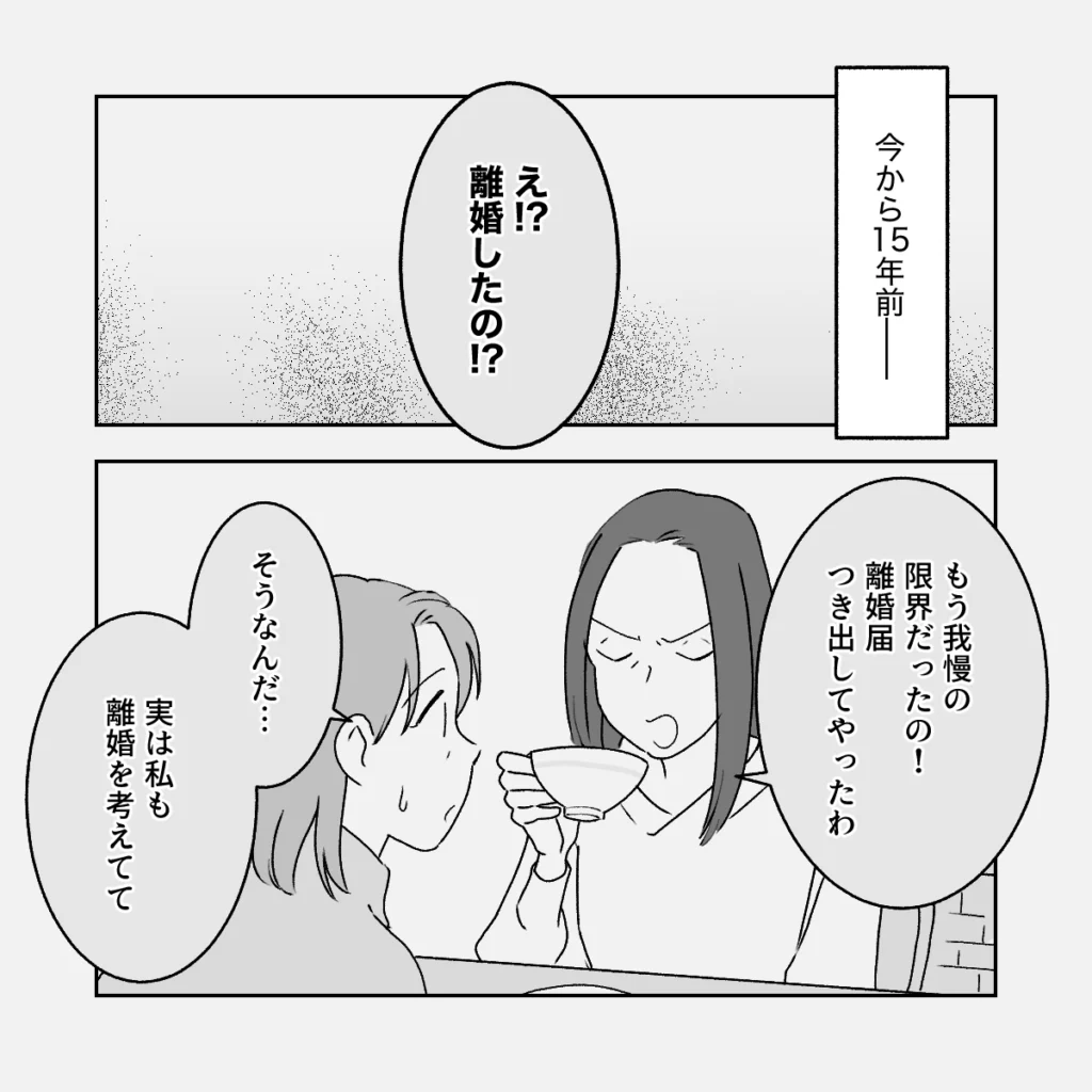 今から15年前のこと。義母は久しぶりに再会した友人から、離婚したことを告げられました。「もう我慢の限界だったの!離婚届つき出してやったわ」そう語る友人に触発されるように、義母もまた自分自身が離婚を考えていることを打ち明けます。