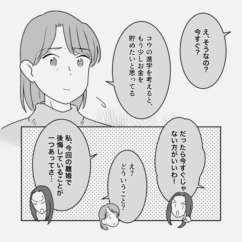 「え、そうなの?今すぐ?」そう聞かれた義母は「コウの進学を考えると、もう少しお金を貯めたいと思ってる」と答えました。すると友人は身を乗り出して「だったら今すぐじゃない方がいいわ!」と言います。「え? どういうこと?」と聞き返すと、友人は「私、今回の離婚で後悔していることが一つあってさ・・・」と、自分の経験を語り始めました。