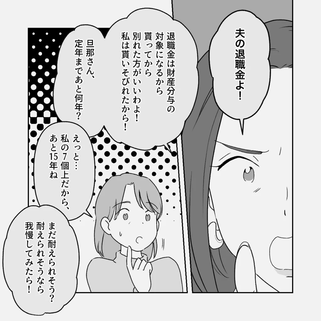 友人は勢い良く「夫の退職金よ!」と切り出しました。「退職金は財産分与の対象になるから、貰ってから別れた方がいいわよ!私は貰いそびれたから!旦那さん、定年まであと何年?」食い気味にそう問われ、義母は戸惑いながらも「えっと・・・私の7個上だから、あと15年ね」と答えます。すると友人は「まだ耐えられそう?耐えられそうなら我慢してみたら?」と提案してきました。