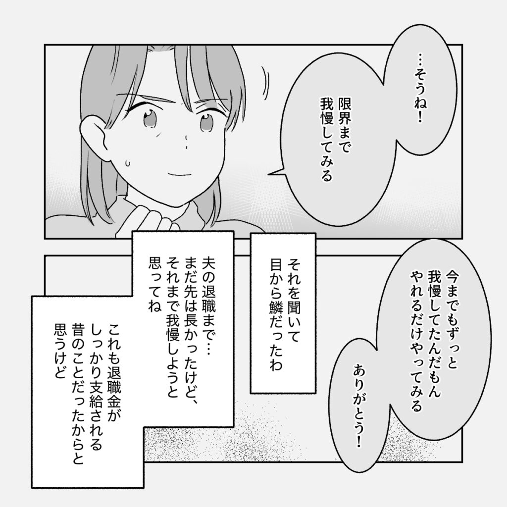 友人の言葉に義母は小さく頷き、「そうね!限界まで我慢してみる・・・今までもずっと我慢してたんだもん、やれるだけやってみる」と答えました。義父の退職まではまだ長い年月がありましたが、それまで耐え抜くと心に決めたのだとか。義母は後に、「終身雇用が当たり前で、退職金がきちんと支給されていたあの時代だったからこそ考えられた選択よ」と話していました。
