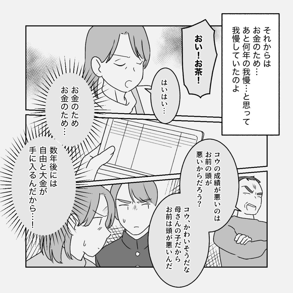 それから義母は、お金のために耐える日々を送ることになりました。家政婦のように扱われても、コウの成績が悪い原因を自分のせいにされても、「数年後には自由とまとまったお金が手に入る」と自分に言い聞かせながら、ただひたすら耐え続けたそうです。