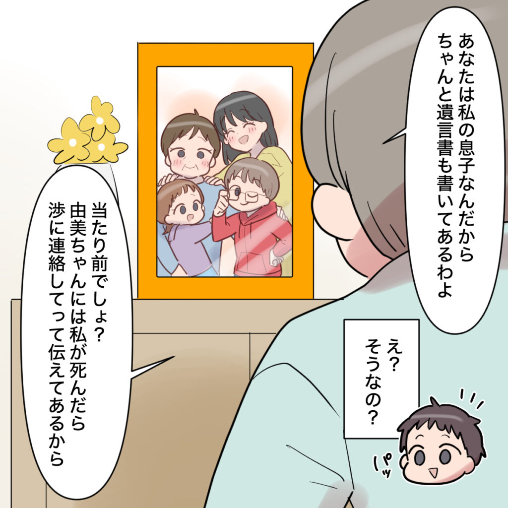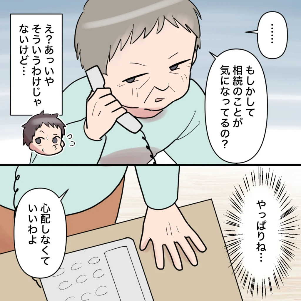 渉は、きっと四宮家の財産を狙っているのでしょう。私が由美ちゃんに財産を渡すつもりだと踏んで、「親孝行」なんて耳ざわりのいい言葉を使って近づいてきたに違いありません。「もしかして相続のことが気になってるの?」私がそう問いかけると、図星だったのか明らかに動揺しながら「え?あっいや、そういうわけじゃないけど」と苦し紛れにシラを切りました。・・・やっぱり、本当にどこまでも救いようのない息子です。