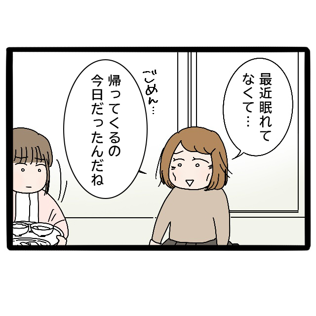 「大丈夫ですか?」と声をかけると、みずほ先輩は力のない表情で「最近眠れてなくて・・・ごめん、帰ってくるの今日だったんだね」と言いました。私が実家に帰る日すら分からなくなるほど、育児に疲弊しているのでしょうか。
