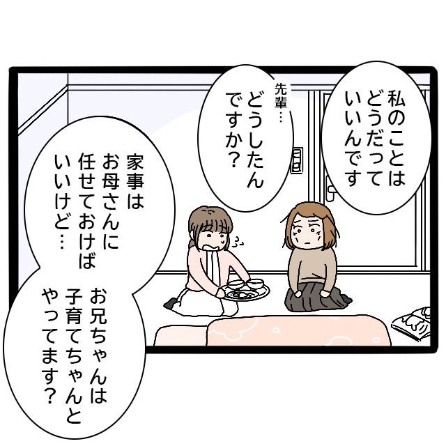 私はみずほ先輩に、「私のことはどうだっていいんです、先輩どうしたんですか?家事はお母さんに任せておけばいいけど、お兄ちゃんは子育てちゃんとやってます?」とたずねました。ここまでやつれてしまうなんて、もしかすると兄が育児に関わっていないせいなんじゃないか・・・そんな不安が頭をよぎります。