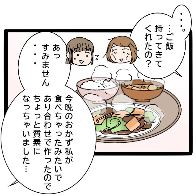 しかし、みずほ先輩は私の質問に答えることなく、「・・・ご飯持ってきてくれたの?」と話題を変えました。私はとっさに、「あっすみません、今晩のおかず私が食べちゃったみたいで、あり合わせで作ったのでちょっと質素になっちゃいました」と謝ります。