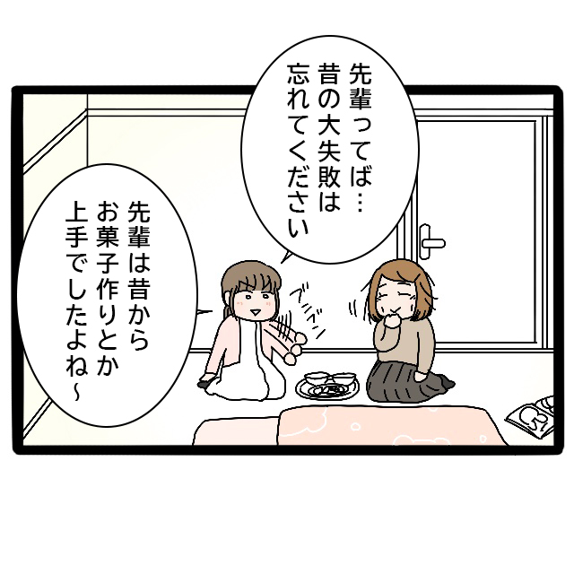 照れくさくなった私は、「先輩ってば昔の大失敗は忘れてください!先輩は昔からお菓子作りとか上手でしたよね~」と言いました。先輩の表情が少し明るくなってよかった。きっと、育児を経験した人にしか分からない悩みがたくさんあるんだろうな。