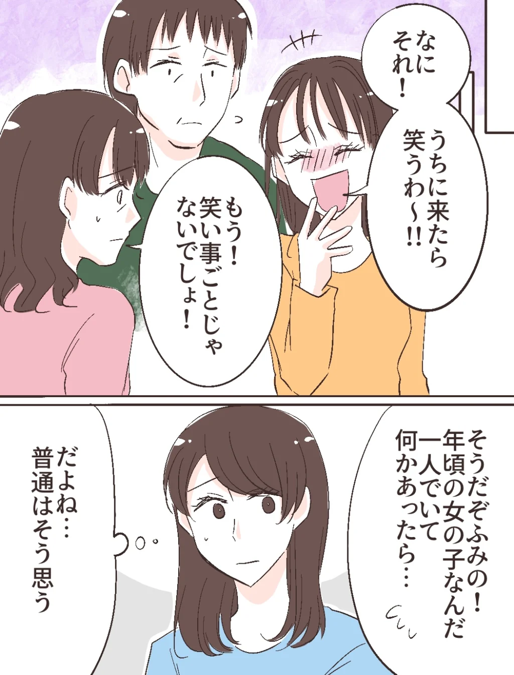 「なにそれ!!うちに来たら笑うわ~!!」話を聞いたふみのが吹き出しながらそう話すのを聞いて「もう!笑い事じゃないでしょ!」とたしなめるお母さん。「そうだぞ、ふみの!年頃の女の子なんだ、1人でいて何かあったら・・」とお父さんも心配するなか、「・・だよね。普通はそう思う」と冷静に考える私。