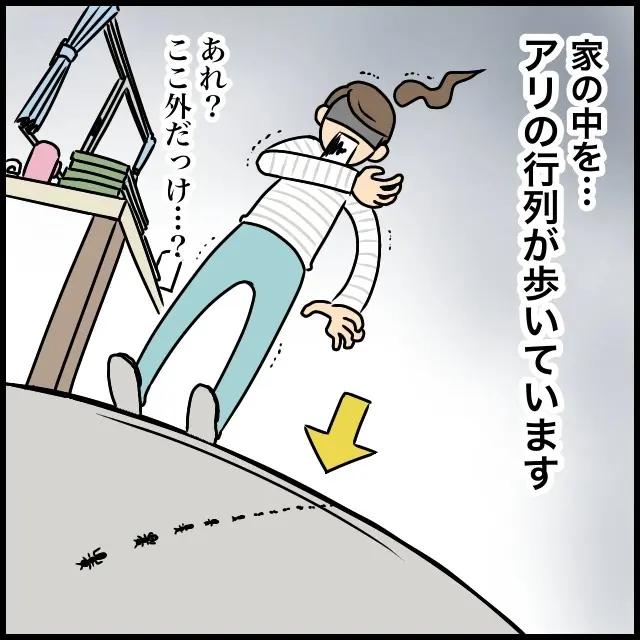 だって・・家の中をアリの行列が歩いていたのです。あれ?ここ外だっけ・・?一瞬、自分がいる場所が家の中なのか外なのかわからなくなりました。