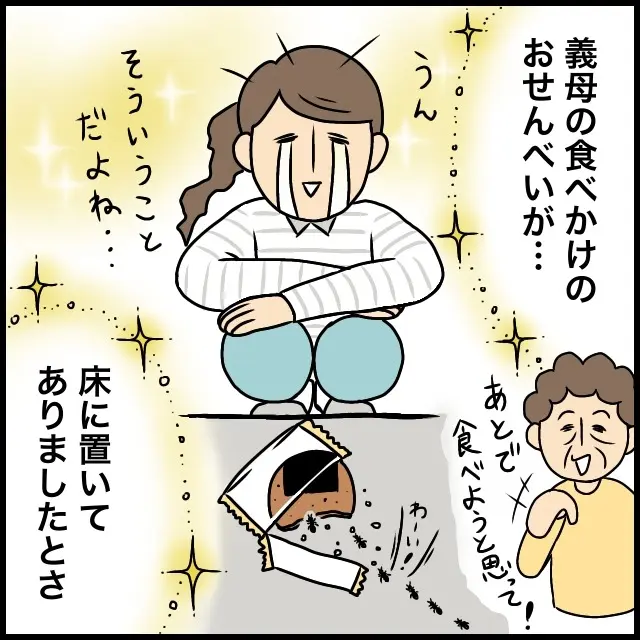 行列の先にあったのは、食べかけのおせんべい・・。あ、コレ・・さっき義母が食べてたやつ。しかも、テーブルの上とかではなく、床に置いてありましたとさ。おせんべいを片付けてアリを外に出した後、義母にアリがおせんべいを運んでたと伝えたら、「あとで食べようと思って!」と笑顔で言われました。いいんですよ、いいんですよ。食べかけのおせんべいをちょっと置いておくなんて誰にでもありますよね。でも、でも・・床には置かないでほしいです、お義母さん!