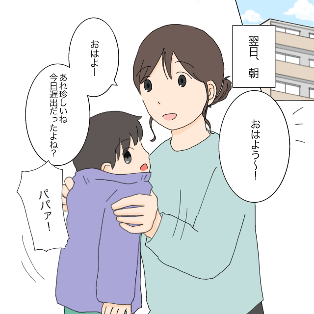 翌朝、私はいつも通り子どもたちに朝ごはんを食べさせ、ゆうたを幼稚園へ送る準備をしていました。すると「おはよう~!」と爽やかな挨拶とともに夫が起きてきます。今日は遅出だと聞いていたので、こんなに早く起きてきたことに少し驚きました。