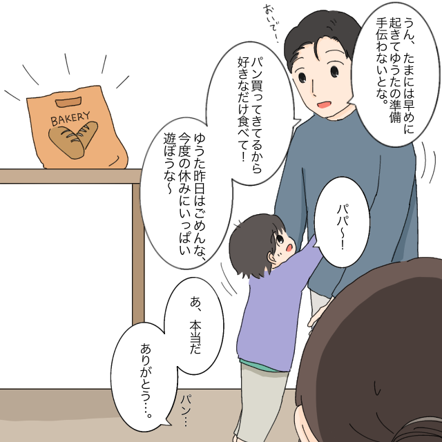 「おはよ、あれ珍しいね、今日遅出だったよね?」と声をかけると、夫は「たまには早めに起きてゆうたの準備手伝わないとな、パン買ってきてるから好きなだけ食べて!」と、珍しく気の利いたことを言いました。その気遣いを嬉しく思いつつも、少し驚きながら「あ、ありがとう・・・」とお礼を伝えます。