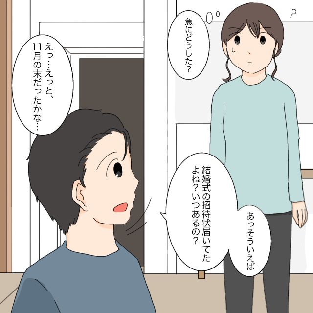 今まで一度も「ゆうたの準備を手伝う」なんて言ったことがなかったのに、どういう風の吹き回しでしょうか。すると、夫がふと思い出したように、「あっそういえば、結婚式の招待状届いてたよね?いつあるの?」と聞いてきました。しかも、普段はスマホばかりであまり会話もしないのに、今日はやけに話しかけてきます。私は戸惑いながらも「えっ、えっと11月の末だったかな・・・」と答えました。
