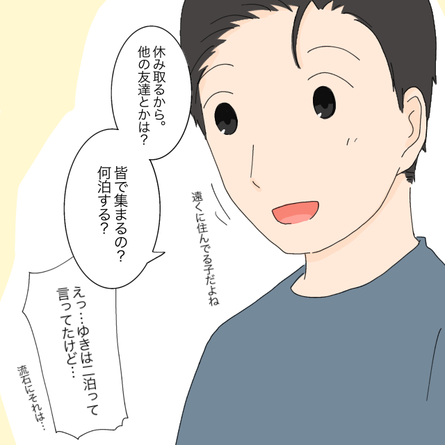 すると夫は「休み取るから、他の友達とかは?皆で集まるの?何泊する?」と矢継ぎ早に聞いてきました。思いがけない言葉に驚き、「えっ・・・ゆきは2泊って言ってたけど、流石にそれは!」と思わず大きな声が出てしまいます。まさか、子どもたちを見てくれるつもりなのでしょうか。
