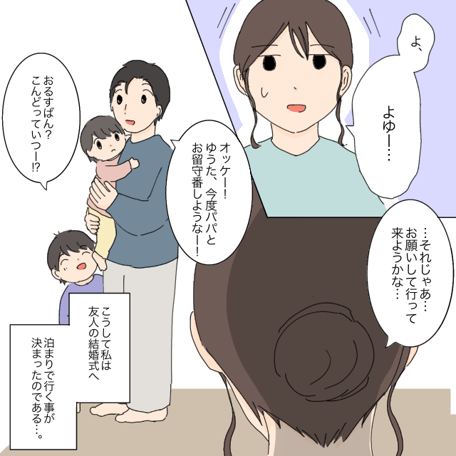 普段ほとんど子どもたちのお世話をしていない夫に「ご飯とお風呂くらい余裕」と言われ、私は複雑な気持ちになってしまいました。普段何もしていないあなたに留守番ができるの?と言いたい気持ちをぐっと堪え「それじゃあ、お願いして行って来ようかな」と、お言葉に甘えることにします。こうして私は、友人の結婚式へ泊まりで行くことが決まったのでした。