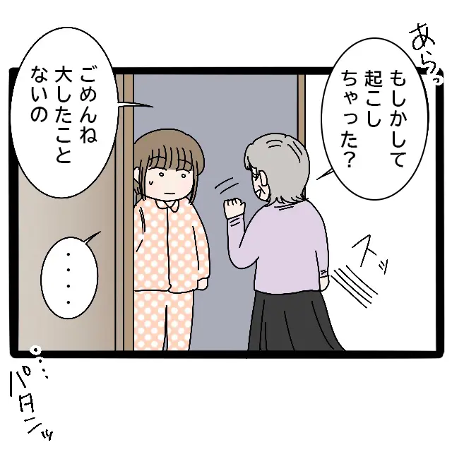 「あらっ、もしかして起こしちゃった?ごめんね。大したことないの」と私の方に歩み寄り、何事もなかったかのように話しかける母に何も言えずにいた私。