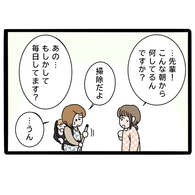 その後、「・・先輩!こんな朝から何してるんですか?」私の言葉に「掃除だよ」とだけ答える先輩。「あの・・もしかして毎日してます?」と聞くと、「・・うん」と小さな声で答えました。