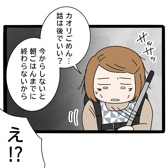 すると、「カオリごめん・・話は後でいい?今からしないと朝ごはんまでに終わらないから」手にほうきを持って掃除しながらそう言う先輩に、「え!?」と思わず大きな声が出てしまった私は、
