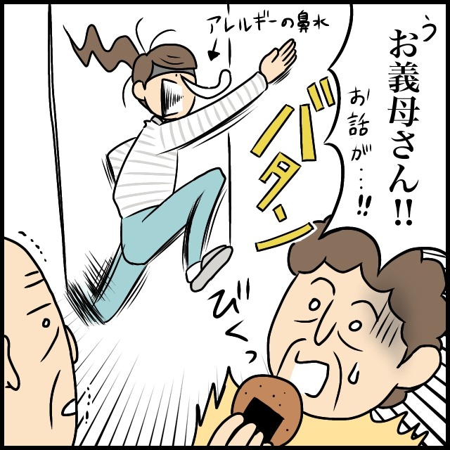 私はリビングのドアを勢いよく開け、「ぅお義母さん!お話が!」と鼻声のまま大きな声をあげました。突然のことに、義母はビクッと肩を震わせて驚きます。のんきにおせんべいを食べている場合じゃないんですよ!お義母さん!