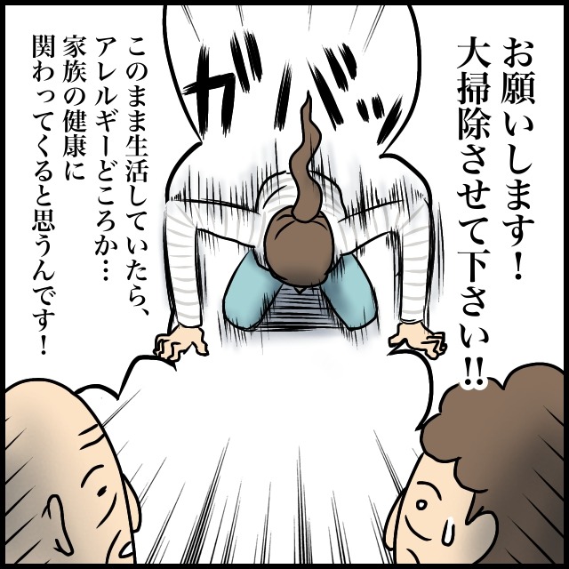 私はガバッと勢いよく土下座すると 「お願いします!大掃除させてください! このまま生活していたら、アレルギーどころか・・・ 家族の健康に関わってくると思うんです!」 と声を張り上げました。
