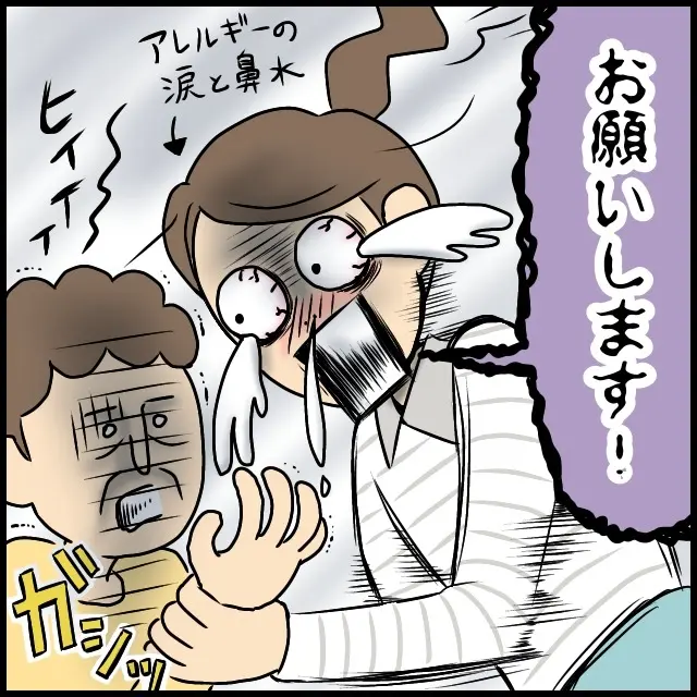 義母に断る隙を与えてはいけないと思った私は、義母の手首をガシッと掴み、必死の形相で「お願いします!」と叫びました。リビングは特にアレルギー源が多いのか、涙も鼻水も止まりません。そんな私の顔を見た義母は、ヒィィ・・・と声にならない悲鳴をあげたのでした。