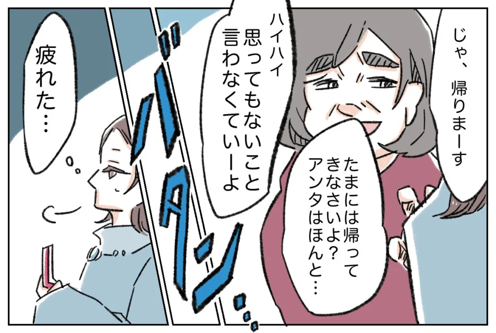 そして、「じゃ、帰りまーす」そそくさと帰ろうとする私に「たまには帰ってきなさいよ?アンタはほんと・・」と言い出す母親に「ハイハイ、思ってもないこと言わなくていーよ」と言って実家を出ると、どっと疲れを感じました。