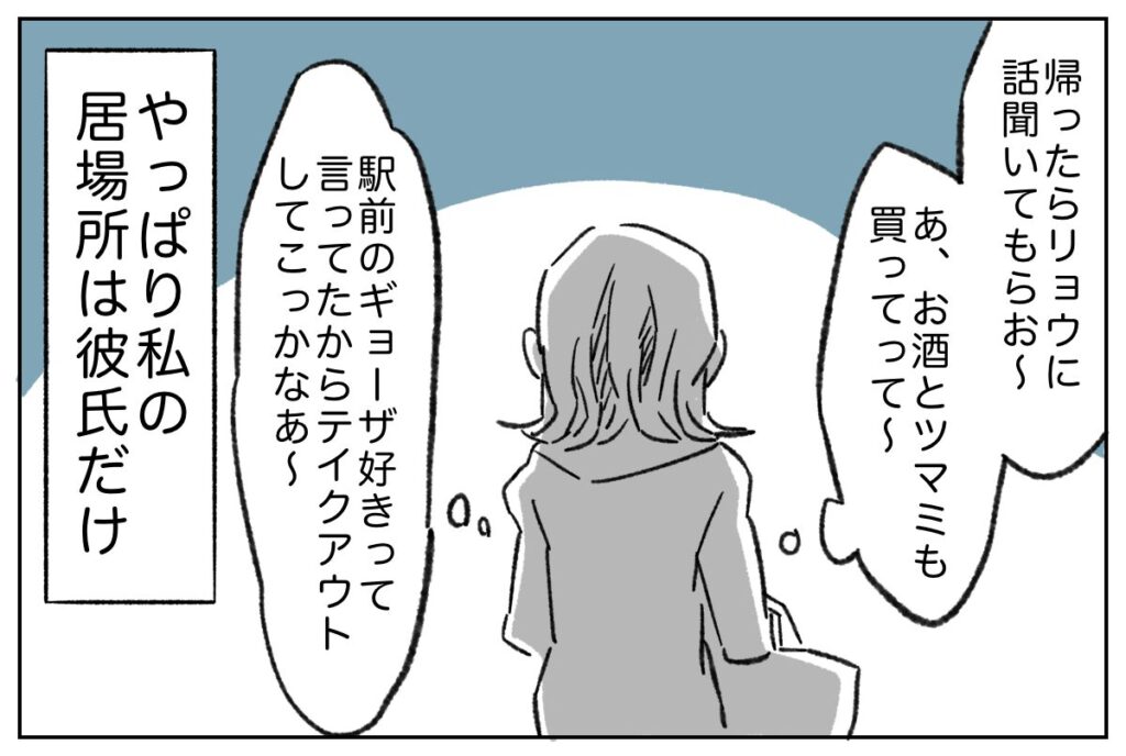 「帰ったらリョウに話聞いてもらお~。あ、お酒とツマミも買ってって~。駅前のギョーザ好きって言ってたからテイクアウトしてこっかなあ~。」やっぱり私の居場所は彼氏だけです。
