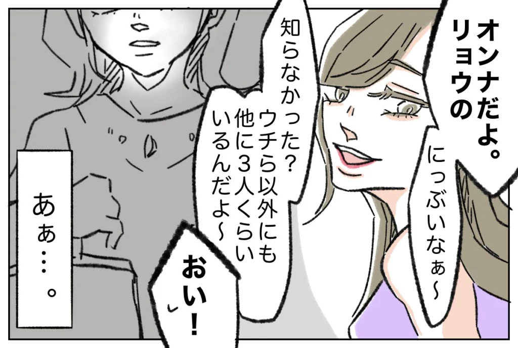 「オンナだよ。リョウの。にっぶいなぁ~。知らなかった?ウチら以外にも他に3人くらいいるんだよ~」うっすら笑いを浮かべながらそう話す女性を「おい!」と言って遮ろうとするリョウ。2人のやりとりを見て「あぁ・・」と呟いた私は、