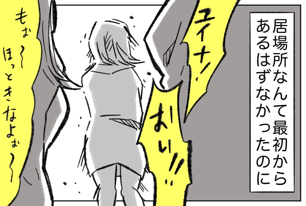 「ユイナ!おい!!」リョウが引き止めようとするも「もぉ~、ほっときなよぉ~」と諦めさせる女性。そう、私の居場所なんて最初からあるはずなかったのに・・。